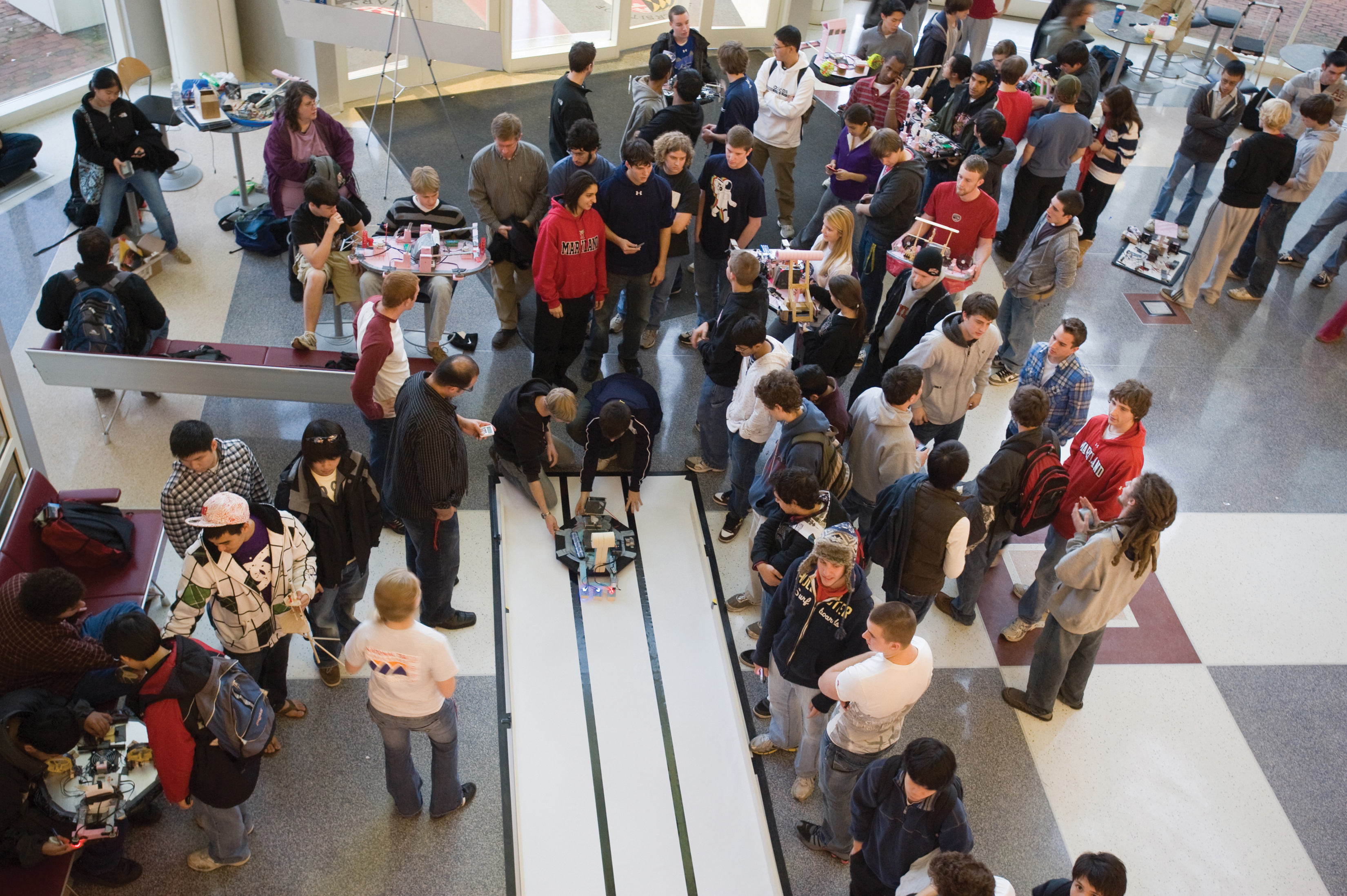 Students, faculty and staff watch a team launch its hovercraft at the start of the competition track in the Kim Engineering Building. Around the track, other teams await their turns. (Photo by Aaron Clamage, A. James Clark School of Engineering, U-Md.) Download the hi-res version